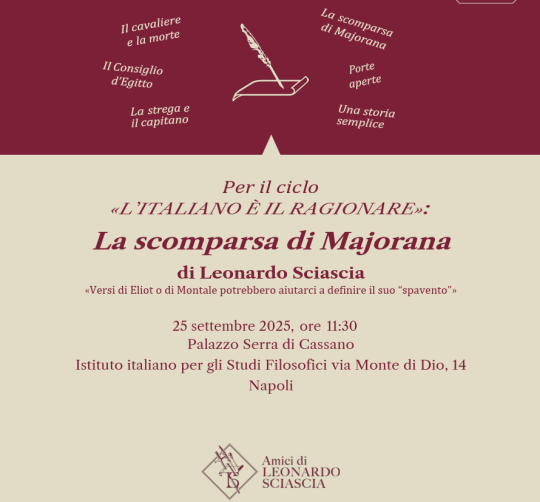 Dedicata all'opera La scomparsa di Majorana («Versi di Eliot o di Montale potrebbero aiutarci a definire il suo “spavento”»), la lezione in programma per il 25 settembre alle ore 11.30 presso l'Istituto italiano per gli studi filosofici (Napoli, via Monte di Dio 14) affronterà le tematiche dell'etica della scienza, della responsabilità dello scienziato e della necessità del superamento della frattura tra cultura umanistica e scientifica. Dopo i saluti istituzionali, la lezione sarà introdotta da Roberta De Luca, docente Liceo Fermi Gaeta e vedrà la partecipazione di Francesco Bonfanti, docente IISS Alessandro Greppi di Monticello Brianza, Valentina Fascia, docente Liceo classico Scuola militare “Nunziatella” di Napoli e Silvio Perrella, scrittore. La partecipazione in presenza sarà certificata ai fini della formazione ma la lezione sarà trasmessa anche in diretta sul Canale YouTube degli Amici di Leonardo Sciascia*, (locandina in allegato).