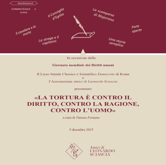 In occasione della Giornata mondiale dei Diritti umani e su iniziativa del Dipartimento di Storia e Filosofia del Liceo Democrito di Roma in collaborazione con l’Associazione Amici di Leonardo Sciascia, martedì 9 dicembre alle ore 12.15, presso l'aula Magna della scuola, si terrà l’incontro dal titolo “La tortura è contro il diritto, contro la ragione, contro l'uomo”. La lezione, curata dalla prof.ssa Tiziana Forzano, approfondirà il tema della tortura a partire dalla lettura del romanzo di Leonardo Sciascia “Il Consiglio d’Egitto”, con l'obiettivo di portare all'attenzione deli studenti le opere dello scrittore siciliano e la loro attualità e importanza civile.