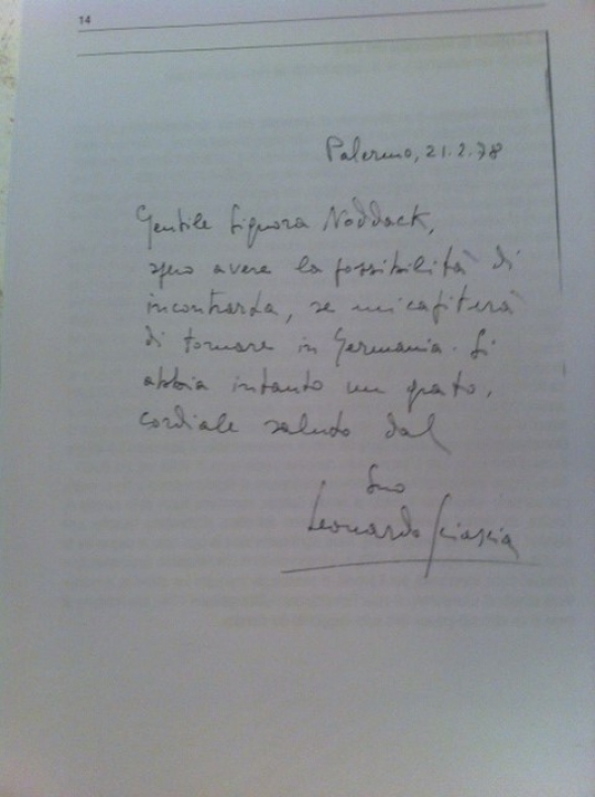 È interessante notare che Leonardo Sciascia stesso prese contatto con Ida Noddack, come attesta il biglietto qui riprodotto, ora visibile nella mostra che la Fondazione di Morgex ha dedicato a Lea Ritter Santini, all’interno della quale una apposita vetrina presenta i documenti che riguardano la comparatista italo tedesca e lo scrittore siciliano: oggetti, dediche di libri e, appunto, il biglietto sopra indicato.