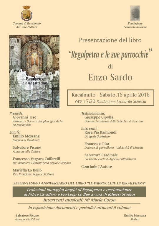 La Fondazione Leonardo Sciascia e l'Assessorato alla Cultura del Comune di Racalmuto, sono lieti di invitarvi alla presentazione del libro "Regalpetra e le sue parrocchie", di Enzo Sardo, pubblicato da Salvatore Sciascia Editore, per festeggiare il sessantesimo anniversario della pubblicazione di "Le parrocchie di Regalpetra".