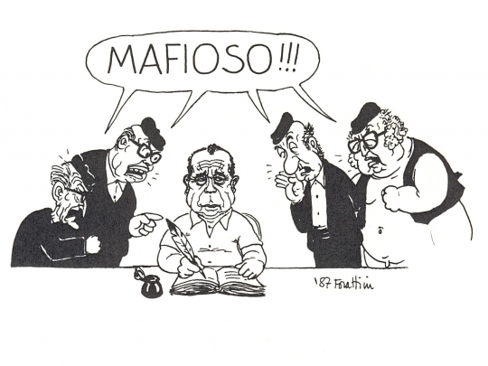 La rubrica “Iconografia” traccia il ritratto di Sciascia come critico d’arte sulle pagine del quotidiano palermitano «L’Ora» (Adele Simioli). Si aggiorna poi alle “Lettere E-F” il «Repertorio dei corrispondenti» dello scrittore» (Salvatrice Graci) proseguendo nell’impegno di offrire uno strumento di studio sui rapporti epistolari del Nostro. Dopo le ricche rubriche di “Recensioni” e “Pubblicazioni ricevute e postillate”, in cui sono presentati complessivamente tredici testi, il “Gran finale” è affidato anche questa volta a una mordace vignetta di Giorgio Forattini, pubblicata in origine su «la Repubblica» nel gennaio 1987, a margine della polemica sui “professionisti dell’antimafia”.