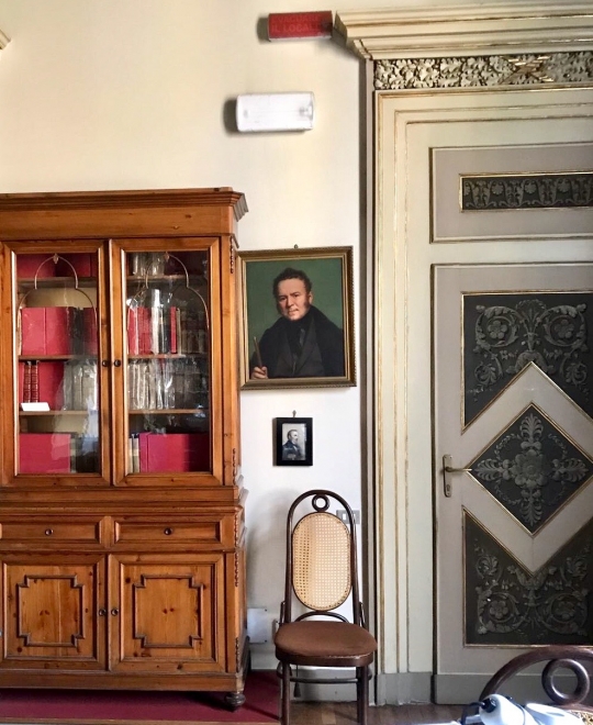 Nella stanza che accoglie il prezioso patrimonio librario sono appesi due ritratti. Si trovano nello strettissimo spazio compreso tra una porta e una delle librerie a vetri un tempo appartenute a Henri Beyle. Il primo, più grande, è il ritratto a olio di Stendhal dipinto nel 1835 da Jean-Louis Ducis; subito sotto, molto più piccolo, c’è il ritratto di Donato Bucci, disegnato a pastello da Filippo Caetani nel 1863. Le dimensioni e anche la qualità dei due ritratti certificano, per così dire, la diversa importanza dei due personaggi. Quanto al loro posizionamento, quasi sicuramente Bucci, l’antiquario di Civitavecchia grazie al quale i libri del Console Beyle non andarono dispersi, ne sarebbe stato entusiasta. Se il suo nome è ancora ricordato, è infatti perché lui ebbe cura dei libri che il suo amico Console di Francia lasciò a Civitavecchia.