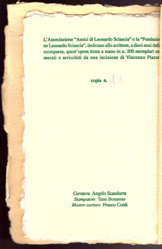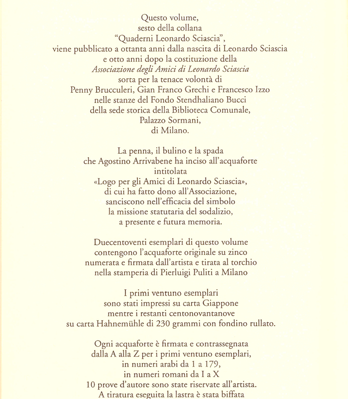 Collana Sciascia Scrittore Europeo (in collaborazione con casa editrice Leo S.Olschki, Firenze). Tutti i volumi, cm. 17 x 24. con incisione sono fuori commercio, destinati ai soli soci