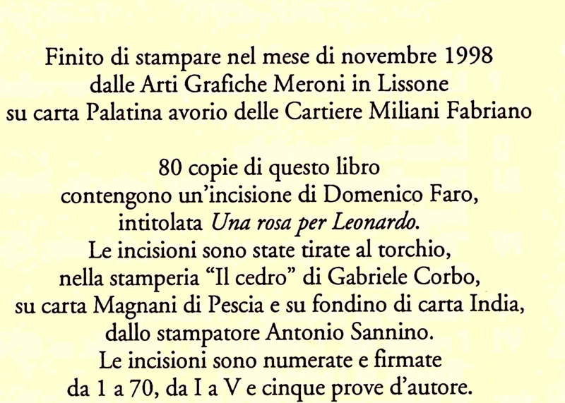 Massimo Onofri “Nel nome dei padri”, Milano 1998, pp. 155 [Collana “Porte aperte, 4] Edizione speciale, con un’incisione originale di Domenico Faro, numerata e firmata, intitolata «Una rosa per Leonardo» tirata a complessivi 80 esemplari
