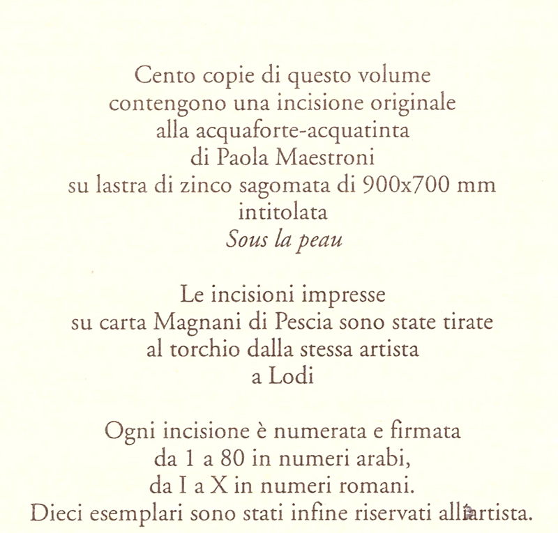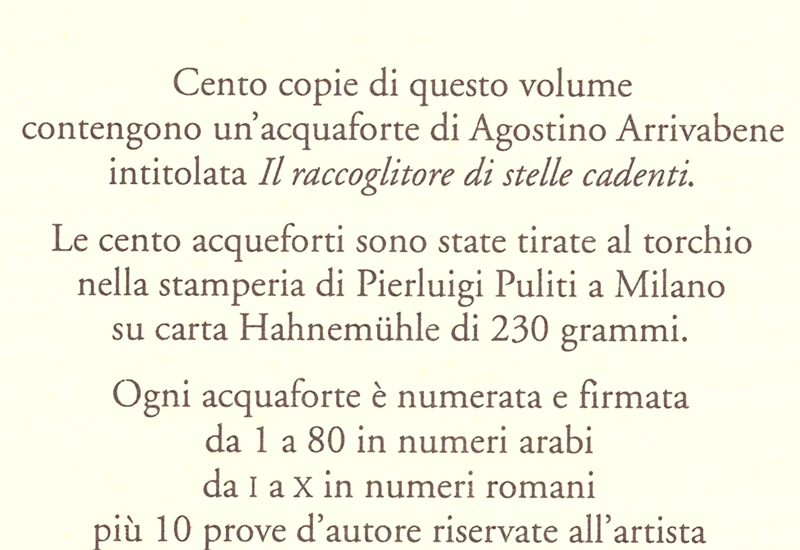 | Di questo volume, è realizzata anche un edizione di testa, con una acquaforte e bulino originale chine collé di Edo Janich, numerata e firmata dall'artista, intitolata «We will remember this planet» tirata a complessivi 105 esemplari | ||