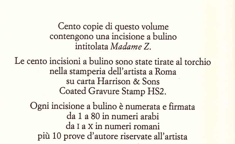 Kazimierz Brandys “Lettere alla Signora Z.”, Milano 2000,pp. 301 [ Collana “Le letture di Leonardo Sciascia”,1] Edizione speciale, con un’incisione originale a bulino di Vincenzo Puliti, numerata e firmata dall’artista, intitolata « Madame Z», tirata a 80 esemplari