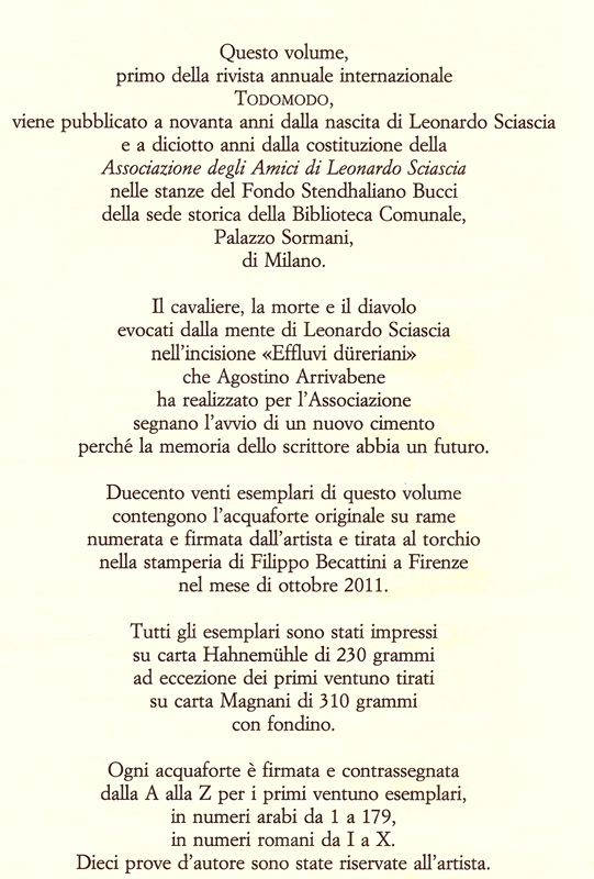 TODOMODO, Volume Anno I, Firenze 2011, pp. XVIII + 314, con un DVD allegato Di questo volume, è stata realizzata anche un’edizione di testa, con un’incisione originale all’acquaforte di Agostino Arrivabene, numerata e firmata dall'artista, intitolata «Effluvi düreriani», tirata a complessivi 220 esemplari