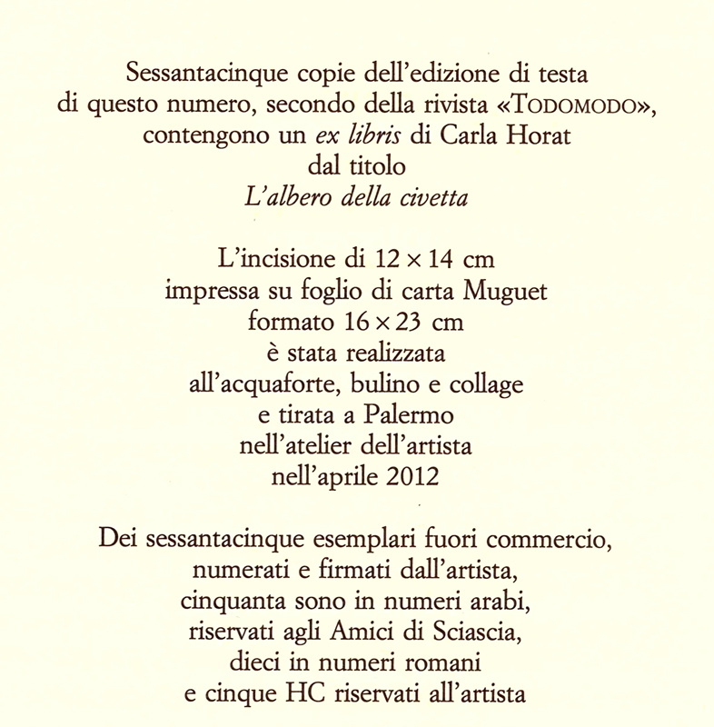 TODOMODO, Volume Anno II, Firenze 2012, pp. XVIII + 418, con un DVD allegato Di questo volume, è stata realizzata anche un’edizione di testa, con un’incisione originale all’acquaforte, bulino e collage di Carla Horat, numerata e firmata dall'artista, intitolata «L’albero della civetta», tirata a complessivi 65 esemplari