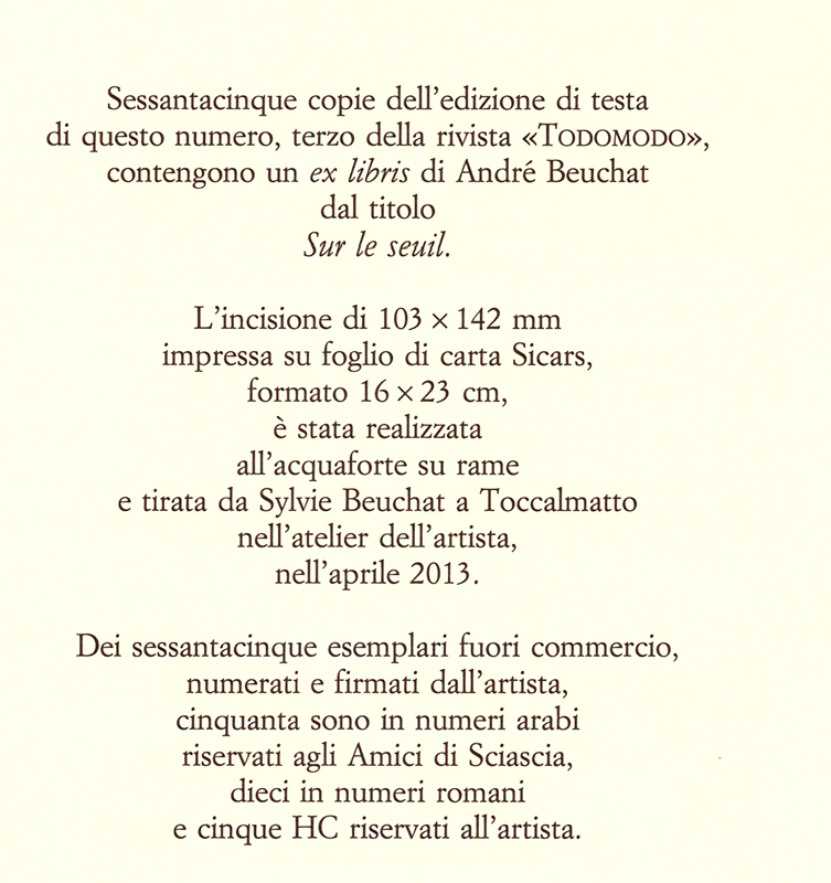 TODOMODO, Volume Anno III Firenze 2013, pp. XX + 294 Di questo volume, è stata realizzata anche un edizione di testa, con un’incisione originale all’acquaforte di André Beuchat, numerata e firmata dall'artista, intitolata «Sur le seuil», tirata a complessivi 65 esemplari