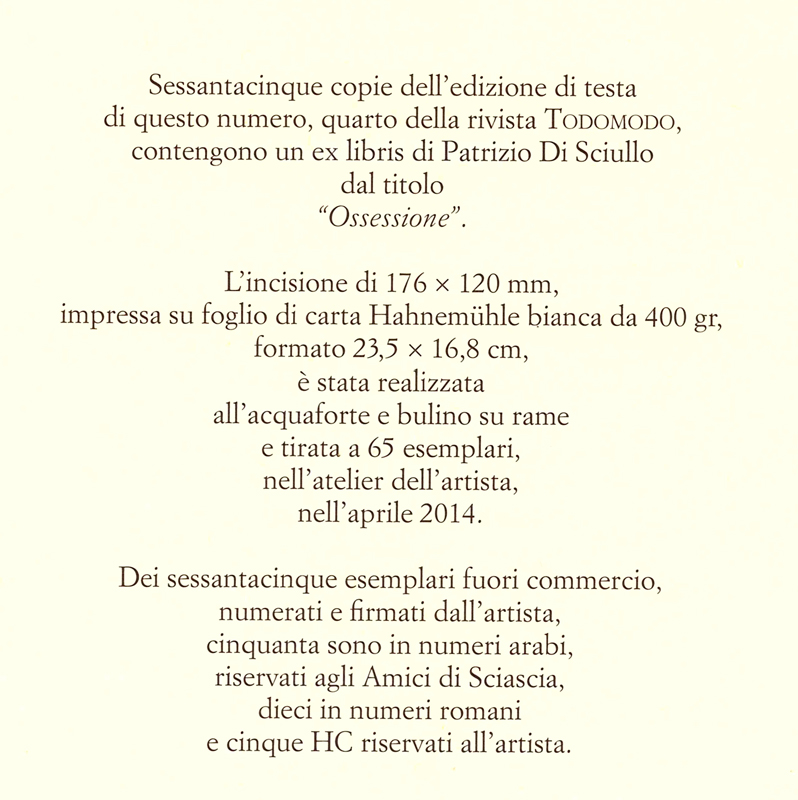 TODOMODO, Volume Anno IV Firenze 2014, pp XVI + 364 Di questo volume, è stata realizzata anche un’edizione di testa, con un’incisione originale all’acquaforte e bulino di Patrizio Di Sciullo, numerata e firmata dall'artista, intitolata «Ossessione» tirata a complessivi 65 esemplari