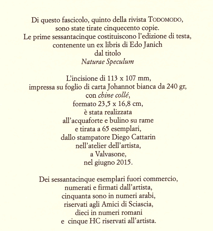 TODOMODO, Volume Anno V Firenze 2015, pp. XXXVI + 364 Di questo volume, è stata realizzata anche un’edizione di testa, con un’incisione originale all’acquaforte e bulino di Edo Janich, numerata e firmata dall'artista, intitolata «Naturae Speculum», tirata a complessivi 65 esemplari