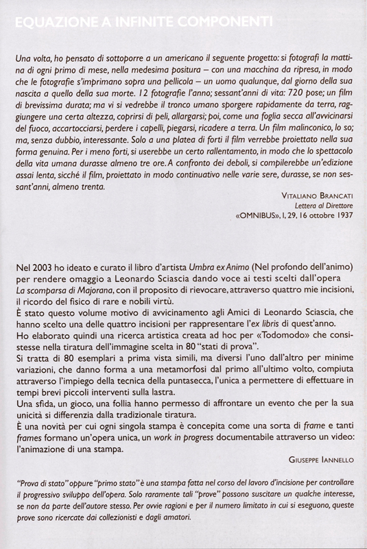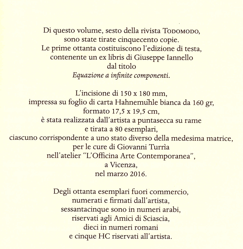 TODOMODO, Volume Anno VI Firenze 2016, pp. X + 390 Di questo volume, è stata realizzata anche un’edizione di testa, con un’incisione originale a puntasecca di Giuseppe Iannello, numerata e firmata dall'artista, intitolata «Equazione a infinite componenti» tirata a complessivi 80 esemplari (ciascuno uno stato diverso della stessa matrice)