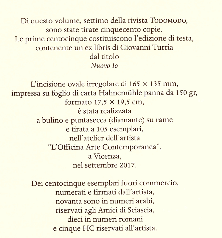 TODOMODO, Volume Anno VII Firenze 2017, pp. XII + 420 Di questo volume, è stata realizzata anche un’edizione di testa, con un’incisione originale a bulino e puntasecca di Giovanni Turrìa, numerata e firmata dall'artista, intitolata «Nuovo Io», tirata a complessivi 105 esemplari