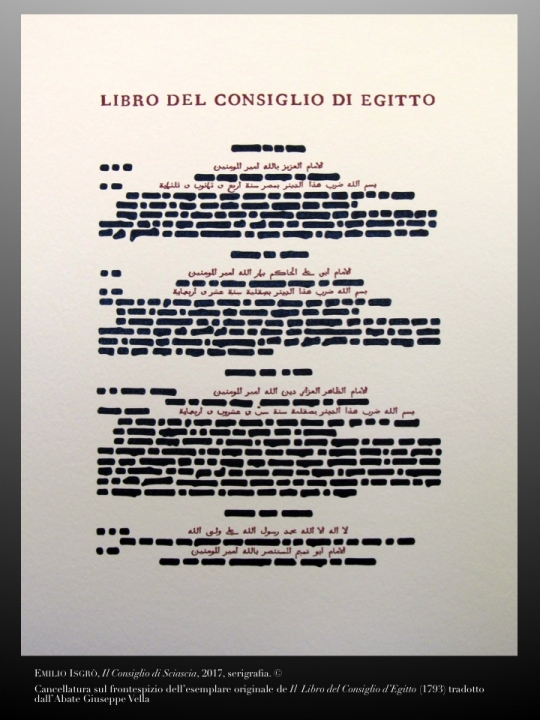 Giovedì 23 novembre alle ore 16.30 viene presentata ufficialmente a Firenze [ Sala Convegni - 1° piano di Palazzo Neroni - Soprintendenza Archivistica e Bibliografica della Toscana, Via de' Ginori, 7 ] la ventitreesima cartella della collana «Omaggio a Sciascia» curata da Francesco Izzo. Alla presenza dell'artista, Emilio Isgrò - di cui in questi giorni è in libreria per i tipi di Sellerio l'autobiografia dal titolo Autocurriculum - si svolgerà un incontro sulla sua opera Il Consiglio di Sciascia, serigrafia in tiratura limitata e fuori commercio, cancellatura del frontespizio de Il Libro del Consiglio d'Egitto dell'abate maltese Giuseppe Vella, dal quale Leonardo Sciascia trasse ispirazione per il suo Consiglio d'Egitto (Einaudi,1963). Dopo i saluti del Vice-presidente della Giunta della Regione Toscana, Monica Barni, i lavori saranno introdotti dalla Soprintendente  Diana Marta Toccafondi e dal Presidente degli Amici di Sciascia, Luigi Carassai.  L'opera sarà poi illustrata da Maria Teresa Giaveri, comparatista dell'Accademia delle Scienze di Torino, alla quale si deve anche l'importante saggo in cartella.  L'ingresso all'incontro è libero, fino a esaurimento dei posti disponibili.