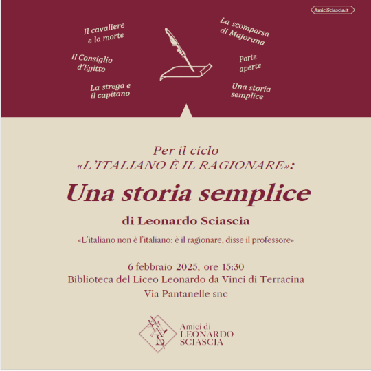 Giovedì 6 febbraio 2025, alle ore 15.30, presso il Liceo Leonardo da Vinci di Terracina (Biblioteca- Via Pantanella Snc), si terrà la prima lezione del ciclo "L'italiano è il ragionare" dedicata all'opera di Leonardo Sciascia Una storia semplice («L'italiano non è l'italiano: è il ragionare, disse il professore»), di cui si esploreranno le diverse potenzialità didattiche, civiche e orientative attorno ai temi della ricerca della verità, della legalità e della lingua. Alla Lezione, moderata dalla prof.ssa Roberta De Luca, Liceo scientifico Fermi di Gaeta, interverranno la prof.ssa Giulia di Perna, Liceo Pacifici e De Magistris di Sezze e il prof. Giovanni Capecchi, Università per stranieri di Perugia. L'incontro, ad ingresso libero, è rivolto a insegnanti e studenti della scuola secondaria di secondo grado e prevede, per la sola presenza, l'attestato di formazione. E' possibile seguire anche da remoto, ma senza certificazione, attraverso il seguente link: https://meet.google.com/srv-qnkj-fxi. Scarica la locandina in allegato!